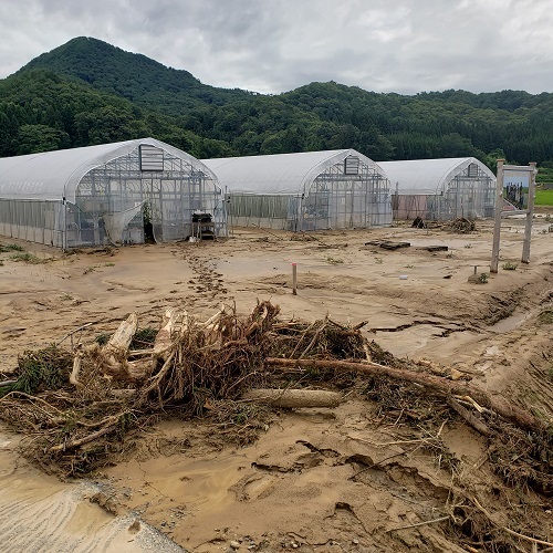 7月までは昨年の収量を超え味もよく期待をしていましたが、8月4日の豪雨による土砂災害に見舞われてしまいました。水稲は全て被害を受けましたが、ボランティアの皆様の協力により何とか半分は収穫できました。園芸はハウス自体の被害は軽微でしたが、内部の培地、栽培箱、給水管、防草シートが被害にあい、栽培が困難な状況となってしまいました。