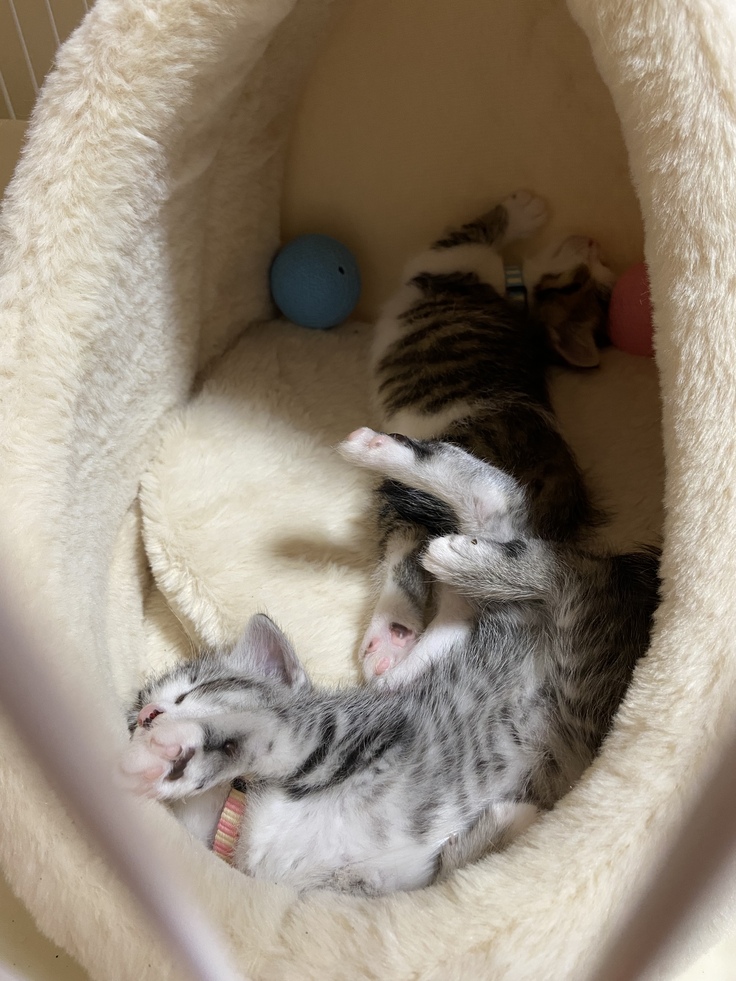 保護したのは親戚で状況はわからないのですが、野良猫が親戚宅の物置付近で出産したらしいのですが親猫が帰ってこなくなり他の子猫もいなくなりこの2匹になっていたので心配で保護したようです。