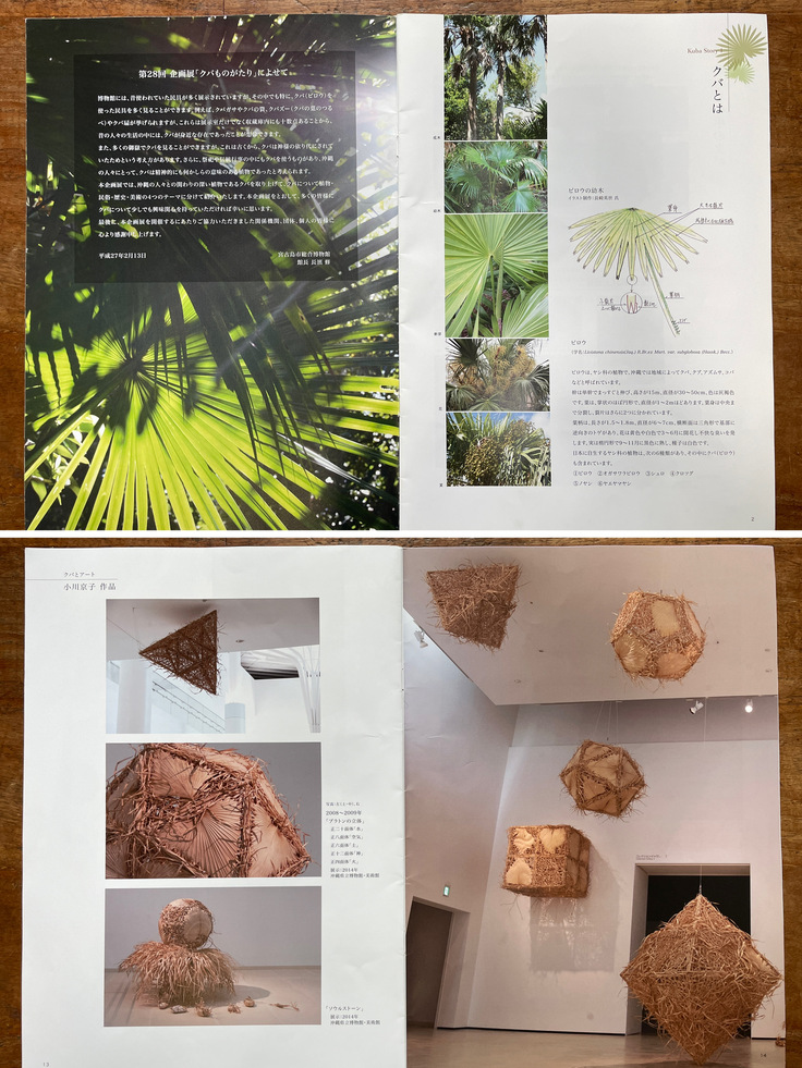 そんな中、宮古島市総合博物館から、展示会の依頼を受けました。私はこの展示会に向けて、博物館のキュレーターの方と共に島内のクバの現状を調査し始めました。この調査を元に博物館から「クバものがたり」(リーフレット)が発行されました。リーフレットは、とても素晴らしい出来栄えで、今もなお多くの人々にクバの事を伝える役割を果たしています。