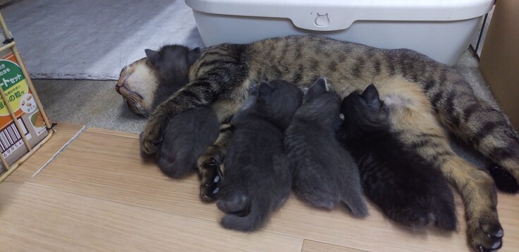 元々、事務所兼工場に、5匹の野良猫ちゃんがいました。その内の1匹が、トラックターに轢かれ亡くなりました。その後も、子猫が次から次へと来るようになり、また同じ事が起こるとと思い。家に連れて帰り保護しました。