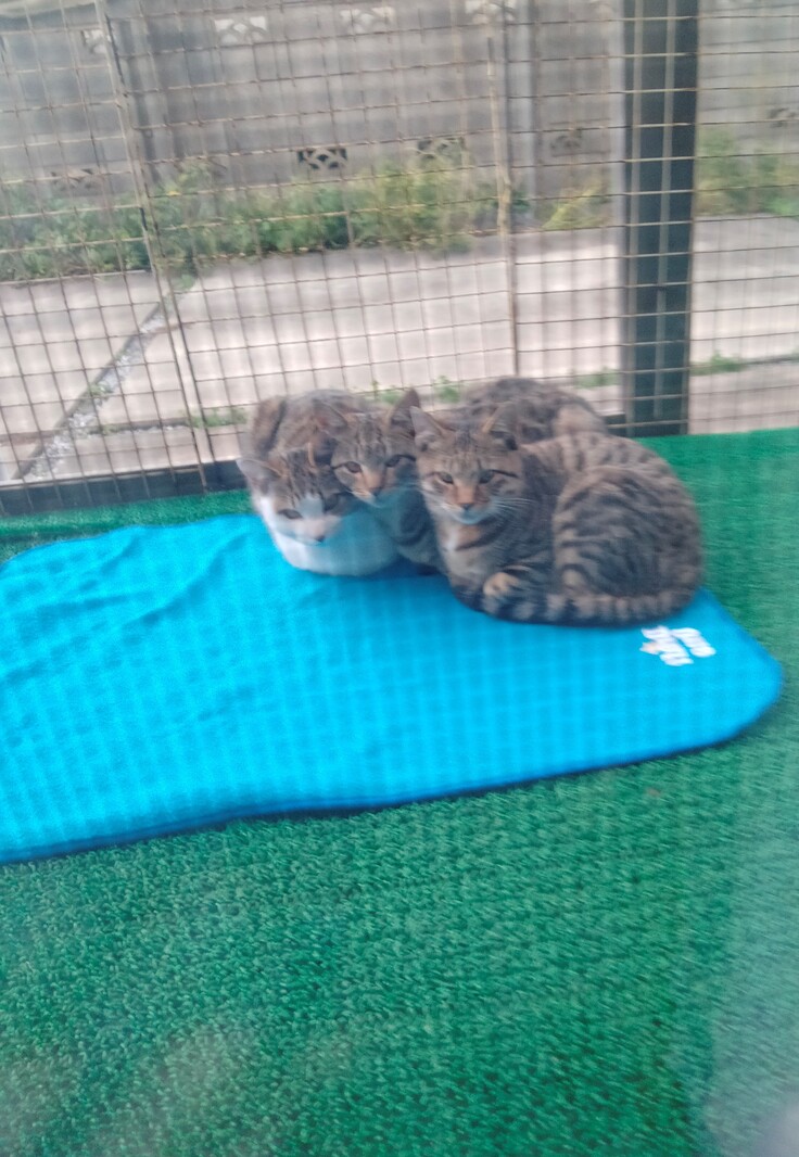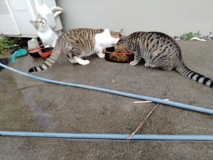 寒いのに家に入らず3匹で温め合っております。真ん中の子が1番甘えたさんです
