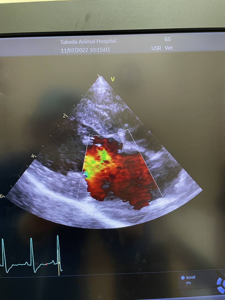 左が健康な心臓です。右が現在のうーちゃんの心臓の状態です。色のついている部分が血液の逆流が見られる箇所になります。僧帽弁閉鎖不全症と診断されてわずか一年ほどで目に見えてわかる程症状が進行していますと主治医の先生から説明がありました。