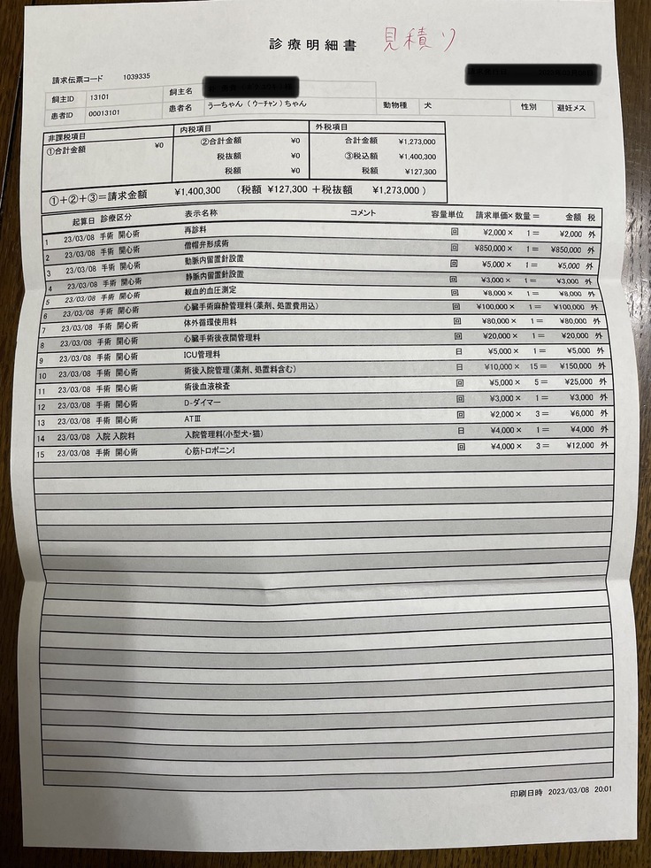 始めは年齢のせいかな?と思っていましたが段々と咳き込む事が多くなり、大好きだった散歩中のダッシュ🏃♀️もしなくなり、もしかして何か悪い病気かも、、と心配になりかかりつけの病院に詳しく診ていただきました。その結果、僧帽弁閉鎖不全症と診断されました。当初は薬を飲みながら適宜検査を行い症状を見守っていましたが、今年に入って初めの検査でかなり危険な状態となっている事が分かり、早急に手術を施さないといつ手遅れになってもおかしくないと言われてしまいました😢。