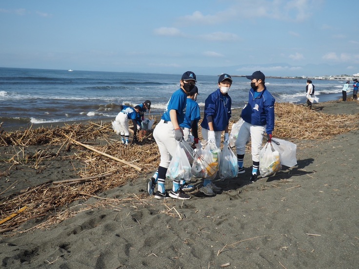 また、毎年5月に大磯港の海岸清掃のボランティア活動を行っています。地域の皆さんとの交流も出来たり、誰が1番ゴミを多く拾えるか勝負をしたり、楽しみながら行うことで自分の大好きなスポーツを通して多くの事を学んでいます。