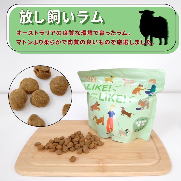 【ラム原材料】ラム肉(骨抜き)、卵、スィートポテト、タピオカ、ラム脂肪(ミックストコフェロールにて酸化防止)、加水分解ラム肉、亜麻仁、酵母加水分解物(βグルカン源)、クランベリー、ブルーベリー、ブロッコリー、タンポポ若葉、ミネラル類(第二リン酸カルシウム、炭酸カルシウム、塩化カリウム、タンパク質キレート亜鉛、タンパク質キレート鉄、タンパク質キレート銅、タンパク質キレートマンガン、亜セレン酸ナトリウム、ヨウ素酸カルシウム、塩化ナトリウム)、ビタミン類(E、A、ナイアシン、パントテン酸、B2、B1、B12、B6、葉酸、塩化コリン)、アミノ酸類(タウリン)、酸化防止剤(ミックストコフェロール)