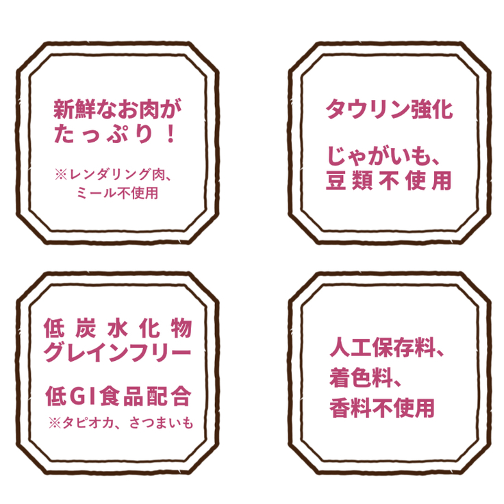 【チキン原材料】鶏肉(骨抜き)、卵、スィートポテト、タピオカ、鶏脂(ミックストコフェロールにて酸化防止)、加水分解鶏肉、亜麻仁、酵母加水分解物(βグルカン源)、クランベリー、ブルーベリー、ブロッコリー、タンポポ若葉、ミネラル類(第二リン酸カルシウム、炭酸カルシウム、塩化カリウム、タンパク質キレート亜鉛、タンパク質キレート鉄、タンパク質キレート銅、タンパク質キレートマンガン、亜セレン酸ナトリウム、ヨウ素酸カルシウム、塩化ナトリウム)、ビタミン類(E、A、ナイアシン、パントテン酸、B2、B1、B12、B6、葉酸、塩化コリン)、アミノ酸類(タウリン)、酸化防止剤(ミックストコフェロール)