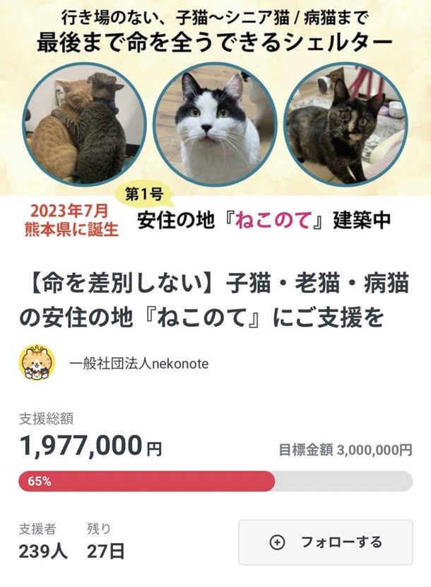一刻も早く保護猫シェルターを始動し、譲渡も同時進行で進めて安住の地や新しい家族の元で生活できるよう保護猫シェルターを実現したいと思いました。
