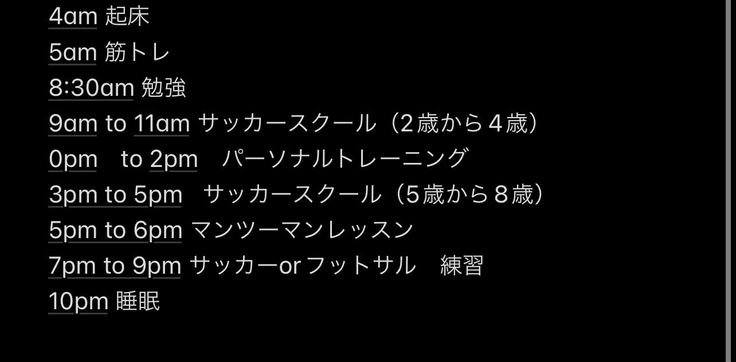 サッカースクールとパーソナルトレーニング、マンツーマンレッスンなどをしながらサッカー、フットサルの選手として生活をしていました。一週間に、15〜18グループの、サッカーレッスン、パーソナルトレーニング、マンツーマンレッスン、グループレッスンをやっていました。