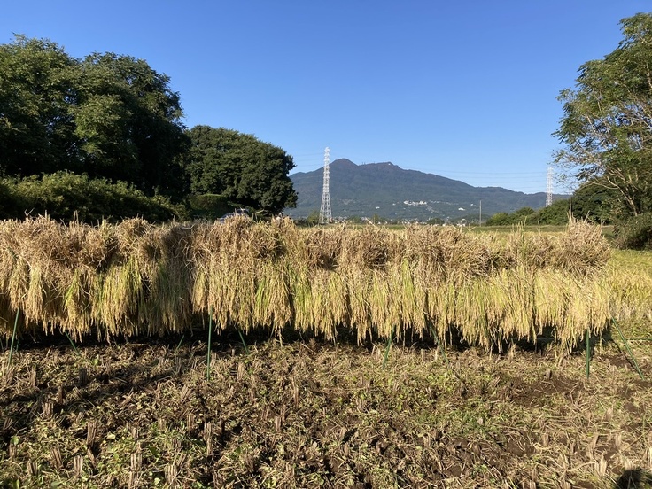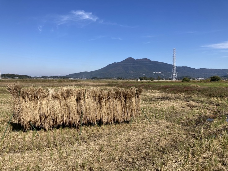 [筑波山を背景に来年の種蒔き用種籾の天干し]