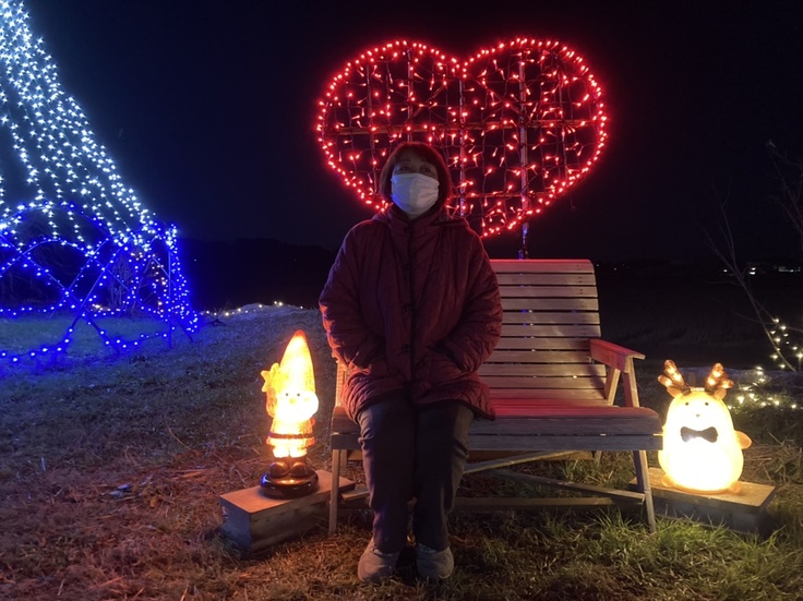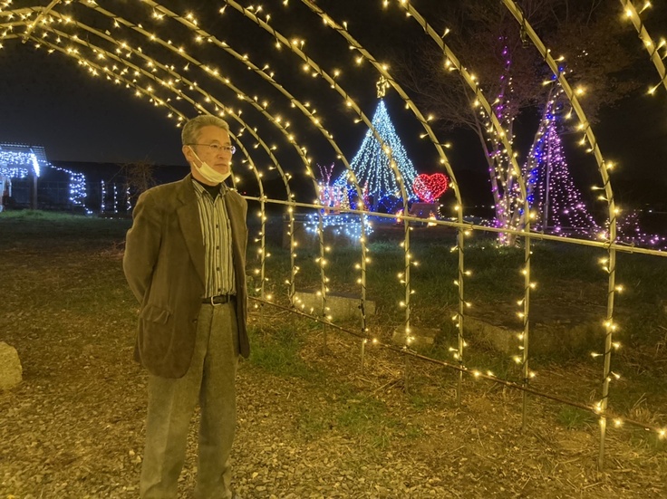 [プロの農家の遠藤さんがつくばの田んぼの中にて将来の地域活性化を見据え、自費でイルミネーションをしている「チョットば」にて]