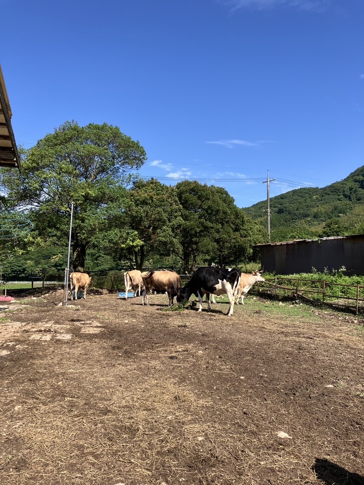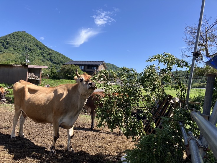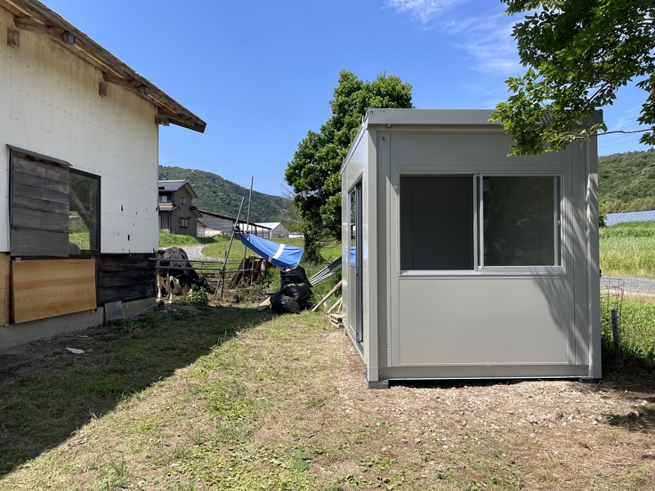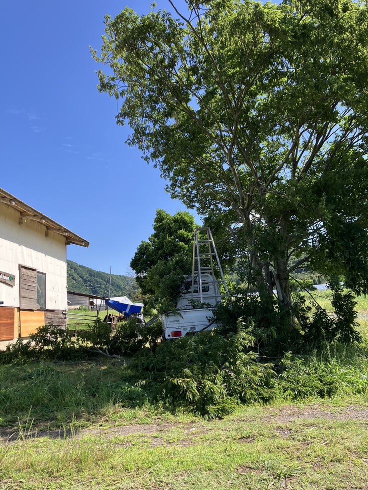 やっと…キッチン用のプレハブを設置出来ました!ユニック車を入れるため、お父さんが入り口の木🌳を切ってくれました。葉っぱ🌿をみんなで頂きましたよ🐮