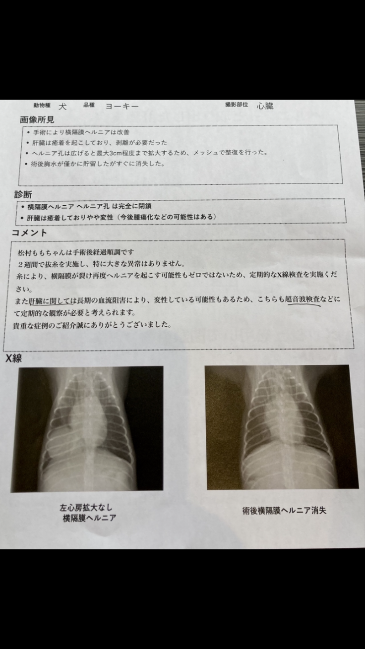 肝臓に関しては長期的に血液を阻害していたので、戻した肝臓の一部が機能していくのかどうか、腫瘍化するのもゼロではないらしく今後定期的なエコー検査、血液検査、レントゲン定期的な検査が必要です。