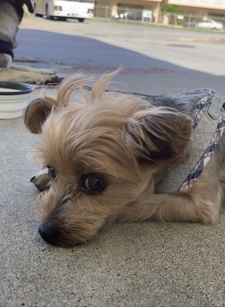 今日朝の散歩。朝から真夏の暑さです。日陰で休憩中のももちゃん。