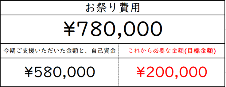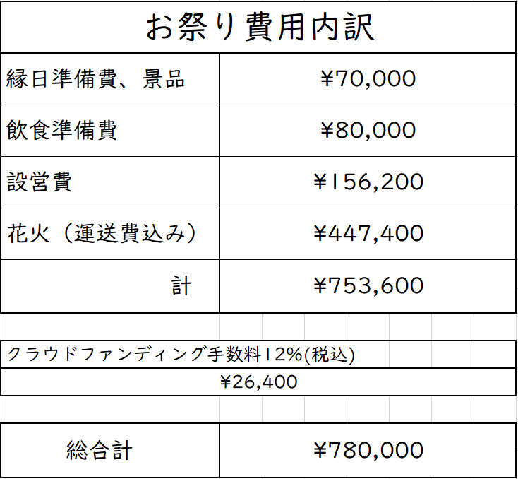 ご支援いただいた資金は、縁日準備費、飲食準備費、会場設営費、花火制作・運送費に使用させていただきます。