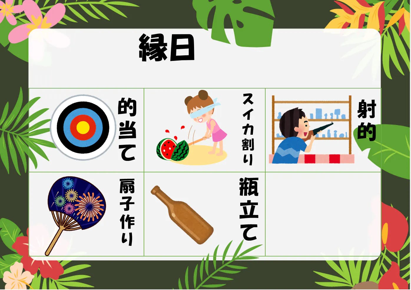 的当て、スイカ割り、射的、扇子づくり、瓶立てを行います。