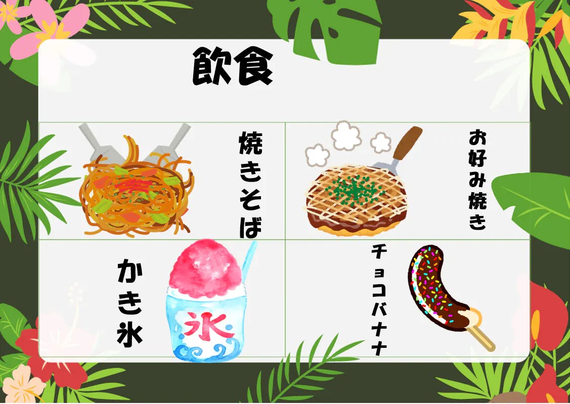 焼きそば、お好み焼き、かき氷、チョコバナナを提供させていただきます。