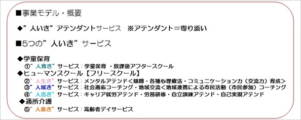 「フリースクール」では、“人生き”アテンダントサービス(メンタルアテンド)、“人域き”アテンダントサービス(社会適応コーチング)、“人活き”アテンダントサービス(キャリア就労アテンド)に至るまで、