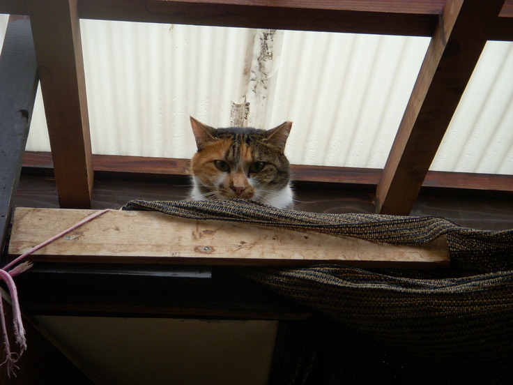 キャティオ内の庇で過ごすピルピル(猫は好きですが人間が嫌いな子です)