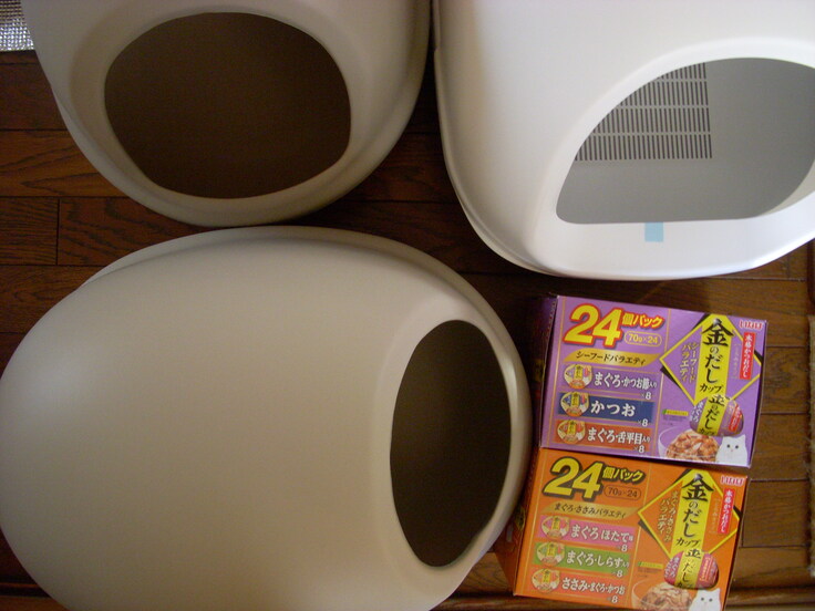金のだしカップ2箱と 猫トイレ3基が届きました!