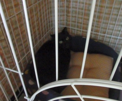 ピザ屋さんで暮らす黒猫のぴぃちゃんは、首の下の脱毛を治療するために私の家で一時的に保護することになりました。