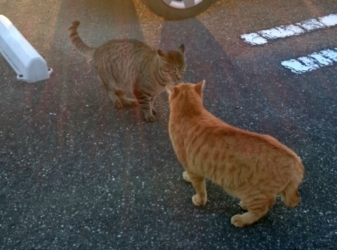 リリースの翌日、流れキジの様子を心配しながら駐車場に着くと、いつもどおり3匹のチャトラーズが出迎えてくれました。