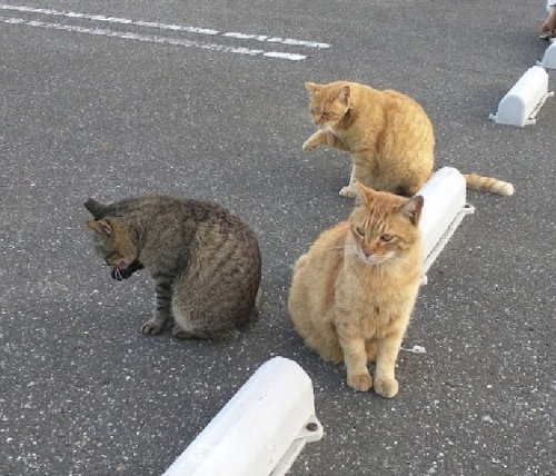 そして、駐車場に着いてチャトラーズを呼ぶと、いつもどおりにチャトラと2号が隅の方から私の元に走り寄ってきました。