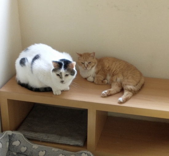 外にいた頃のえりちゃんには仲の良い猫はおらず、むしろ相性の悪い猫ばかりという印象だったのですが、シェルターではともくんとスカーとすっかり仲良しになりました。