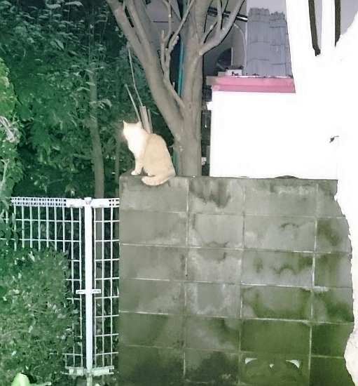 ずいぶんと分かりにくい写真なのですが、深夜に私の家の駐車場に茶白の猫がやってきて驚いた記憶があります。