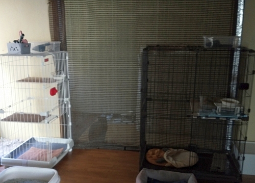 クロママは猫エイズ陽性なのでリビングで他の猫と一緒にするわけにはいかず、さりとて猫エイズ陽性のチャトラと流れキジが暮らす部屋で一緒にするのも躊躇われる、という感じだったのです。