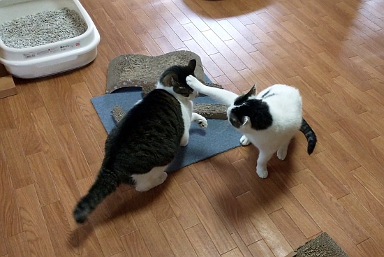オス猫同士ですので顔を合わせた時にちょっとした小競り合いはあるものの、お互いに敵意が無いことは伝わっているようです。