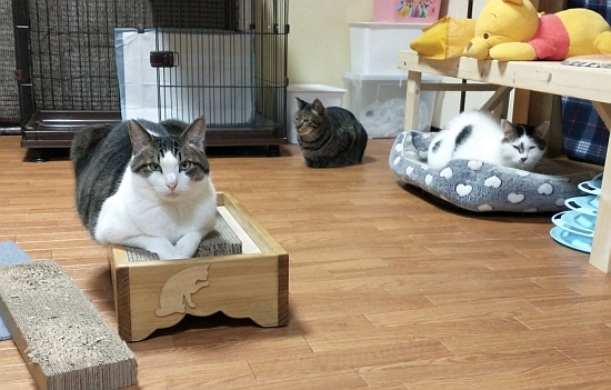 しかし、ひとりきりなのが寂しいのか、5匹で賑やかなリビングを羨ましそうに眺めていることがあります。