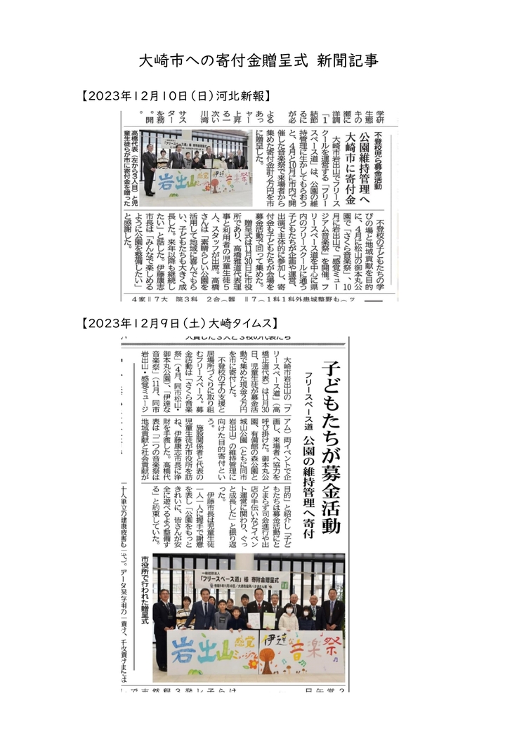 贈呈式では、子どもたちから大崎市長へ直接寄付金が手渡され、その模様が地元新聞紙にも掲載されました。