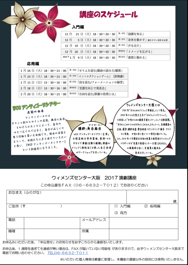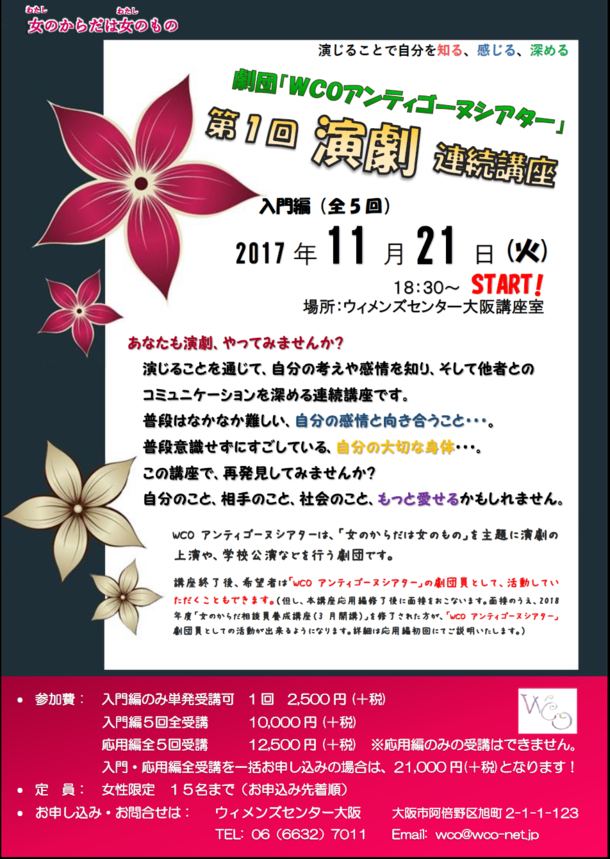 ウィメンズセンター大阪では、性暴力被害を受けた子どもたちの”今、ここ”でのサポートだけでなく、長く続く性暴力被害の影響との闘いの日々から自己コントロール感を取り戻す”未来”にむけたサポートの体制を整えていきたいと思っています。先日出会った子どもは、「いつか支えられる側から支える側の人になりたい」と話してくれました。いつか、その願いがかなえられるように未来にむけたサポート体制を整えるため、これからも様々な企画を発信していきたいと思っています。 その一つの試みとして、劇団『WCOアンティゴーヌシアター』を結成しました。