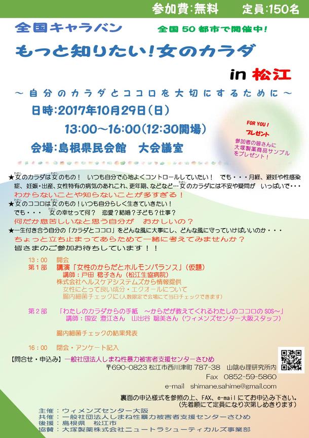 全国キャラバン『もっと知りたい!女(ワタシ)のカラダ』2017の10月以降の開催地をお知らせします!あわせて10月29日(日)の島根県松江市でのキャラバンをご案内!