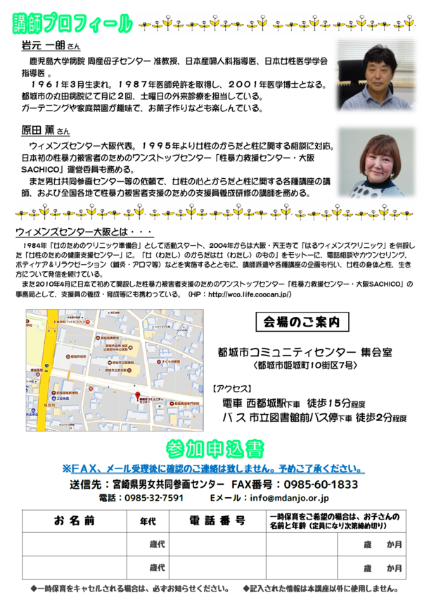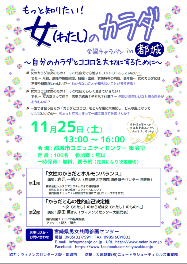 プロジェクトは一旦一区切りですが、ウィメンズセンター大阪は各地で様々な取り組みを展開しています。その一つが『もっと知りたい!女(わたし)のカラダ 全国キャラバン』で、宮崎県都城市での開催が11月25日(土)。今回は主催が宮崎県男女共同参画センターで、ウィメンズセンター大阪が協力しての開催です。