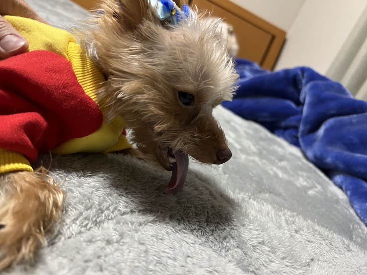 投げて欲しいと何度も咥えて持ってきます。投げてやると走って取りに行ってエンドレスです。また、暑がりの寒がりで、特に寒さに非常に弱くすぐお腹を壊してしまうので服を着させています。気温の変化には気を付けています。そして生まれつき声帯が潰れてワンワンと吠える事ができず、小鳥のような鳴き声です。心臓が悪いせいかチョコタン特有のチョコレート色の部分が早くも抜け、シルバー色になっています。寝る時はいつも一緒で私の足元にピッタリくっついてきます。