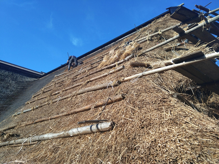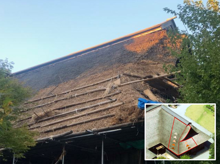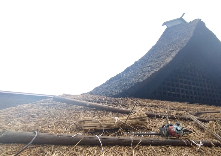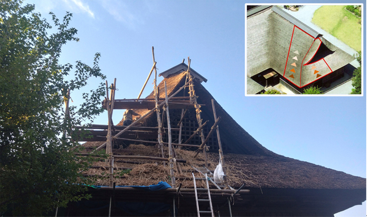 三浦館保存プロジェクトの一つである「主屋の茅屋根修繕(差し茅(さしがや)工事)」