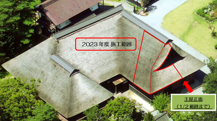今年の工事範囲は下図の赤枠範囲。主屋の顔とも言える正面(1/2範囲)までです。