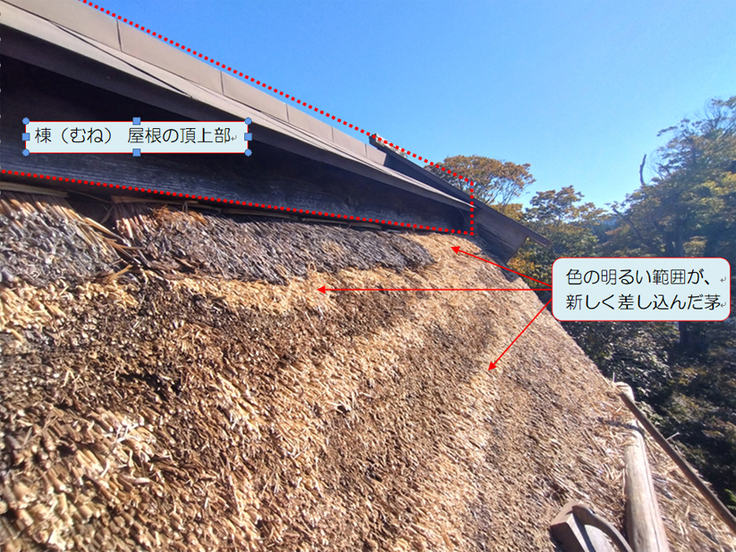 棟(むね)-屋根の頂上部 との間に空いた隙間にも、雨漏りや茅が抜け落ちるのを防ぐため茅を差し込みました。