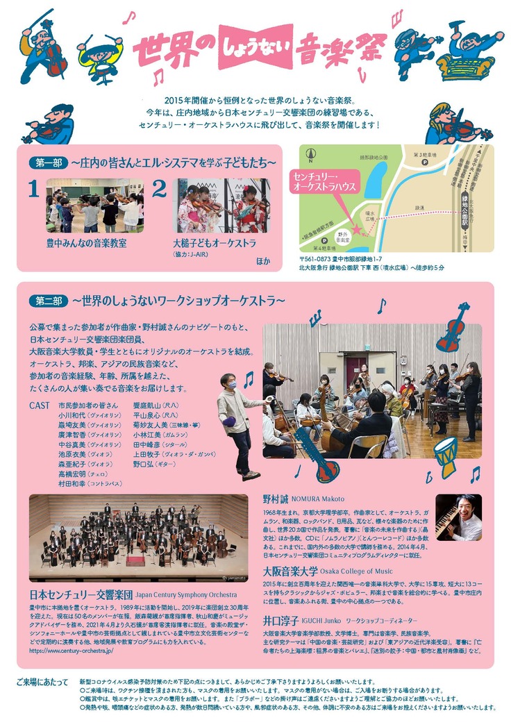 こうした、幾つもの偶然のご縁があったことから、豊中市が毎年、日本センチュリー交響楽団や、同じく地元の大阪音楽大学と開催している「世界のしょうない音楽祭」にて、豊中の子ども達による初めての演奏披露を、という計画が進む中、ここに大槌の子どもたちも一緒に参加し、演奏をすることは、大きな意味があるのではないかと考えました。