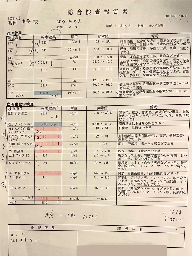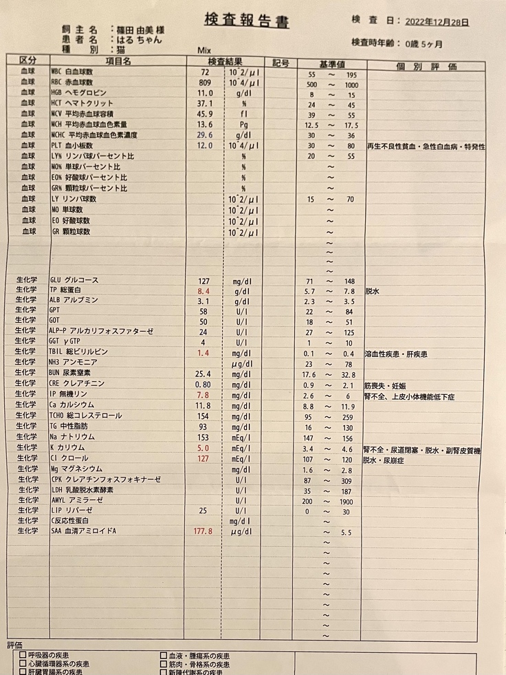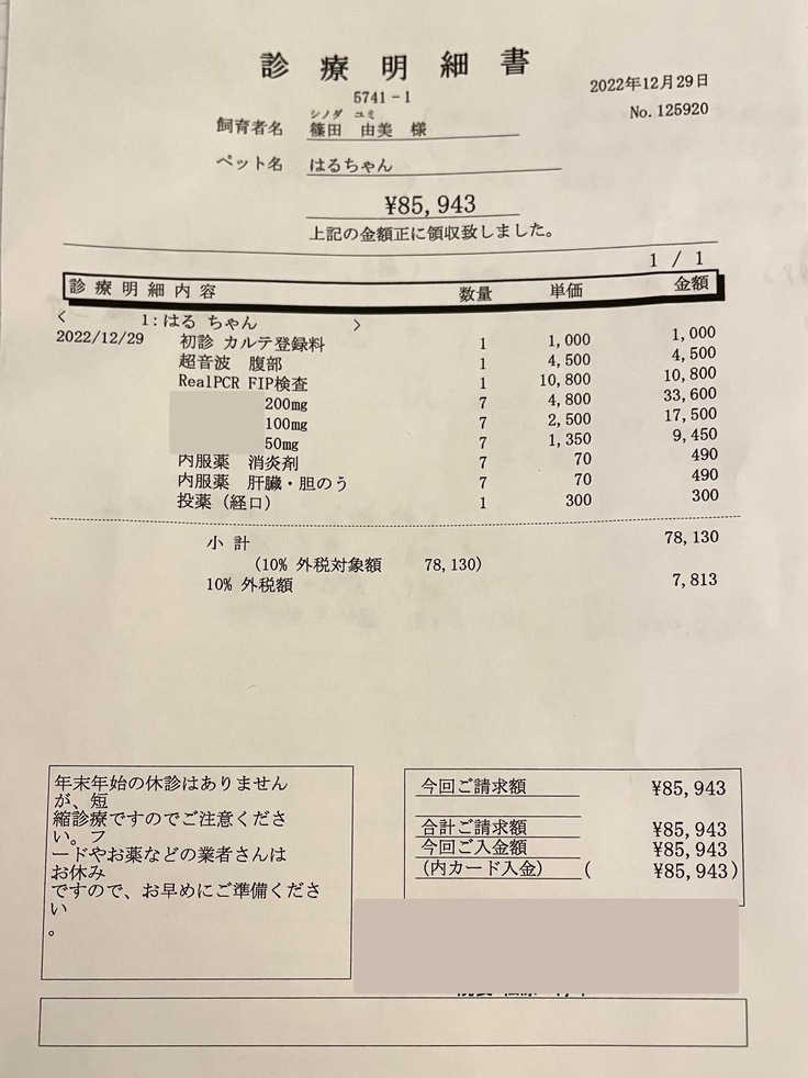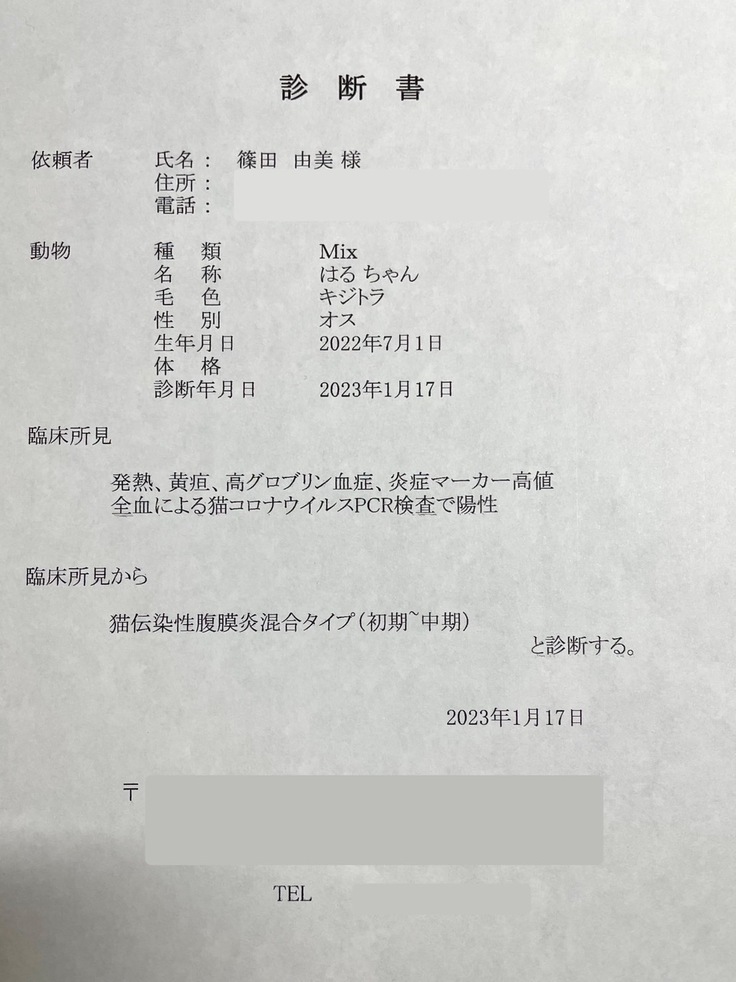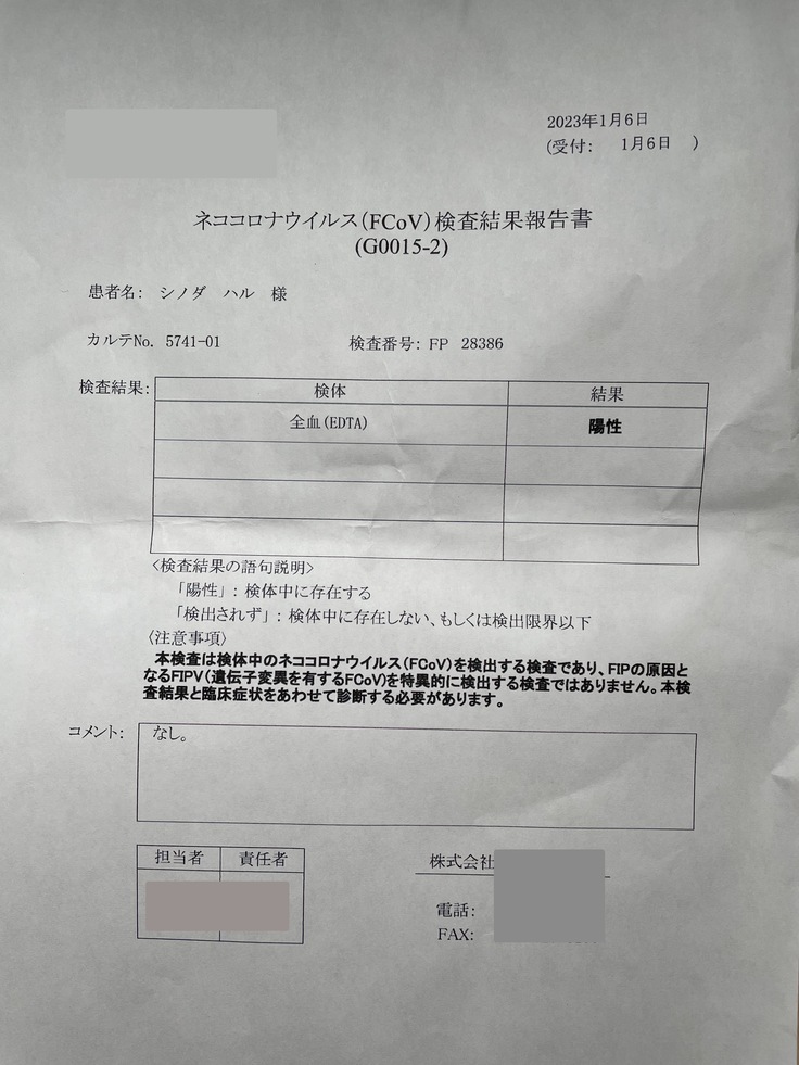 紹介先の病院の院長先生が改めて行ってくださったエコーの結果と持って行った血液検査と合わせて、やはりFIPでまちがいないだろうとの診断でした。