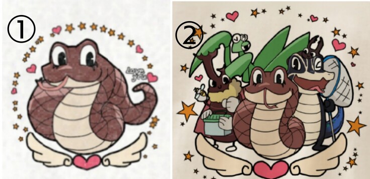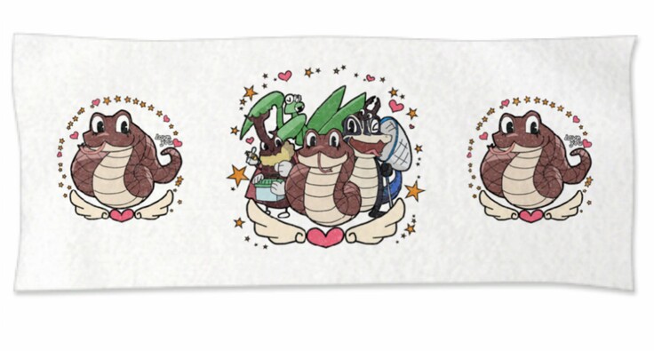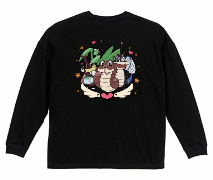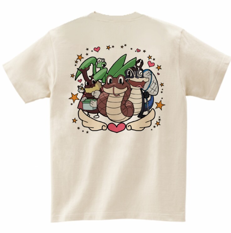 (背中のプリントを無くして胸あたりにのみプリントする事も可能です!また、胸のデザインを①蛇②生き物キャラクターたちかのデザインどちらかも選べます!ですので希望があれば変更できます♪)