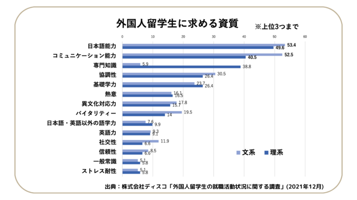外国人留学生を採用する際、『日本語でのコミュニケーションの能力』がやはり重視されています(下図)。