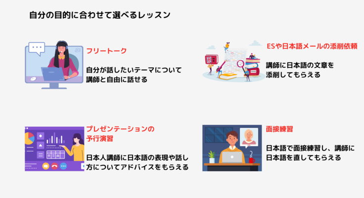 また、留学生の目的に合わせて、様々なタイプのレッスンやアドバイスを受けることができます。