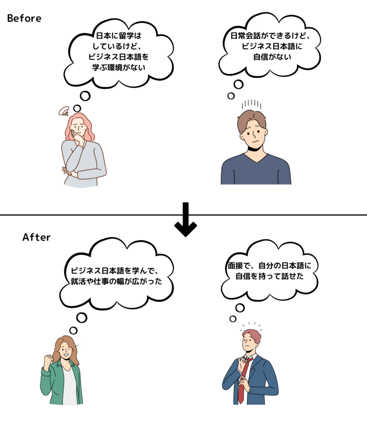 日本には多くの外国人留学生がいますが、 実はビジネス日本語を練習できる環境は少ないため、日本語スキルをビジネスレベルへなかなか上達できない現状があります。