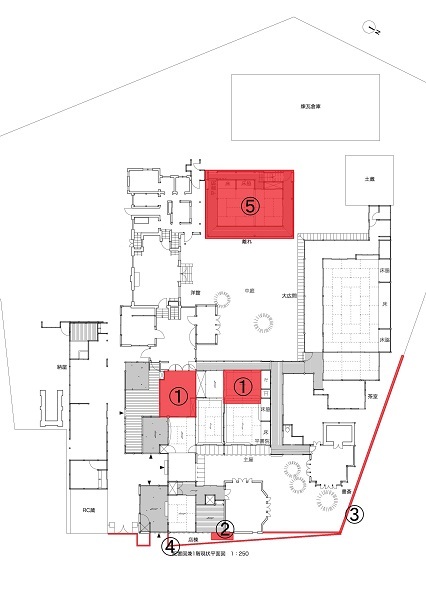 現状では、下図①の主屋棟の食堂、和室及び仏間のいくつかの梁に「支え」となる支持材の設置と、④の劣化した道路側の木柵の撤去が完了しました。