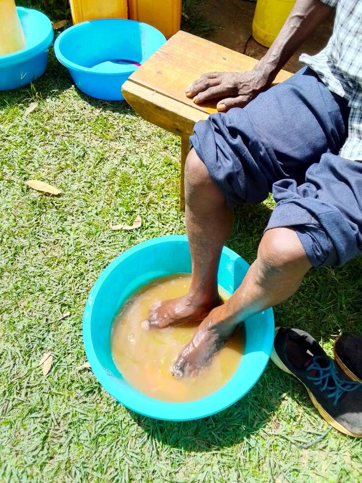 まず、Savlonという薬を入れたお湯の中で足についた泥や土を落とし綺麗に洗います。
