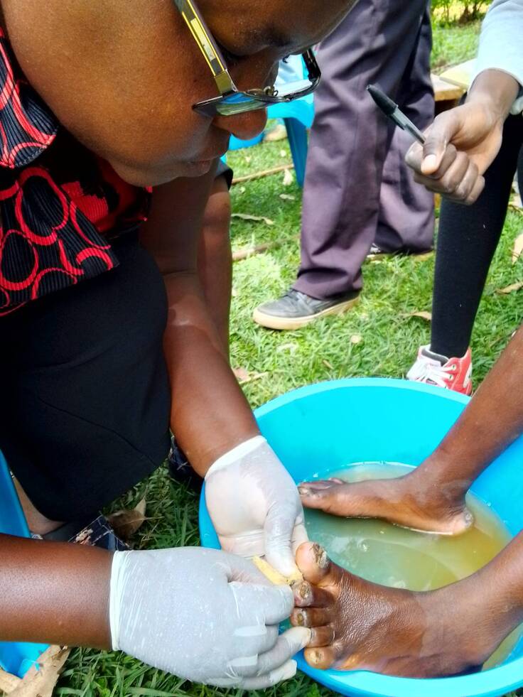 次に、洗った足の爪をネイルナイフで切ります。この時同時に、外まで膨れ上がって出てきているスナノミの卵もえぐり取ります。治療器具を使い慣れているコミュニティヘルスボランティア(CHV)の方々が丁寧に行ってくださいました。