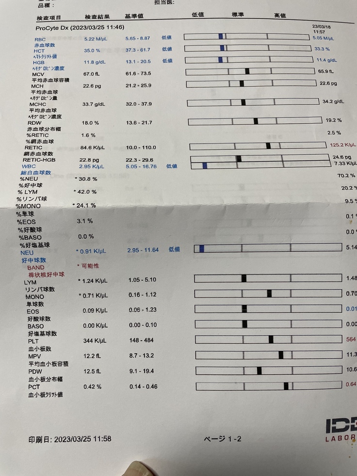 抗がん剤で正常な細胞も攻撃してしまうみたいで、パターン的には抗がん剤の翌週は好中球下がるみたいです