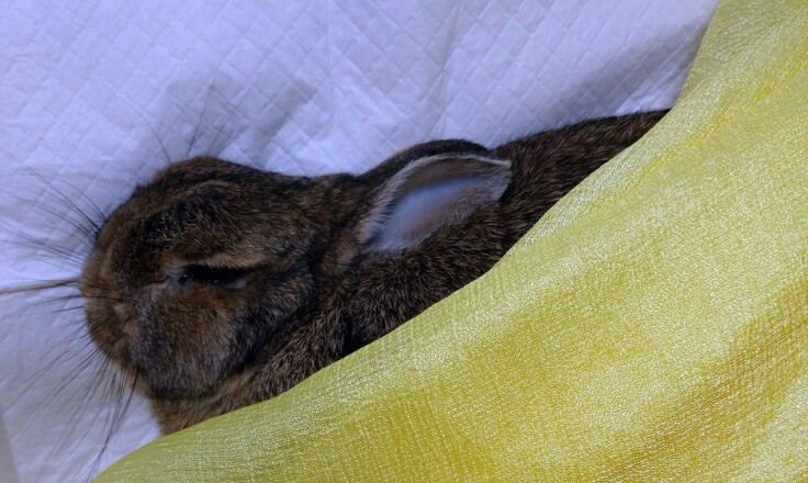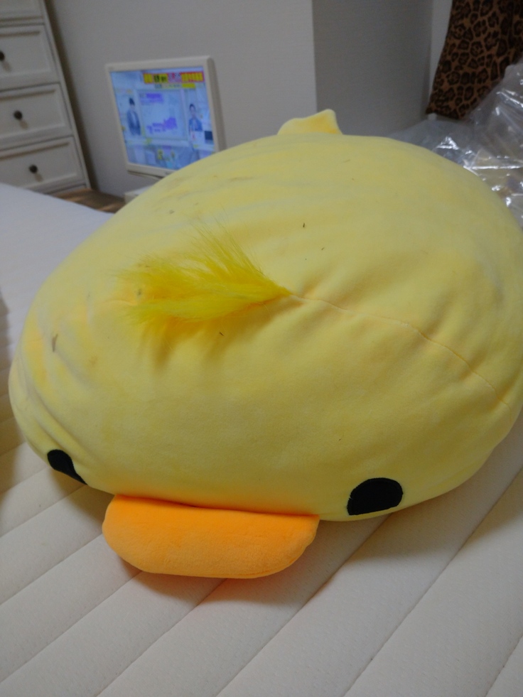 朝方、ままの膝の上に、ぼくの3倍くらいある相棒の、ふわっふわっの ぴよたんを置いて、そこにぼくは横になると、カラダがふんわりラクになったの。